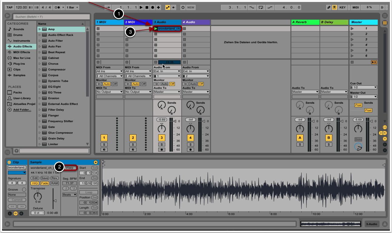 Per Drag&Drop ziehen wir ein beliebiges Ausgangssample in einen der leeren Slots von einer der beiden Audiospuren. Wir haben als Ausgangsmaterial einen Ausschnitt des Hörbuches “Alice in Wonderland” verwendet (1).