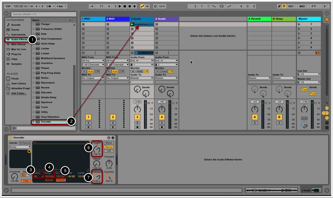Aus der Liste mit allen verfügbaren Effekten wählen wir zunächst den Vocoder aus und ziehen diesen per Drag&Drop auf den belegten Slot in der Audiospur (2).