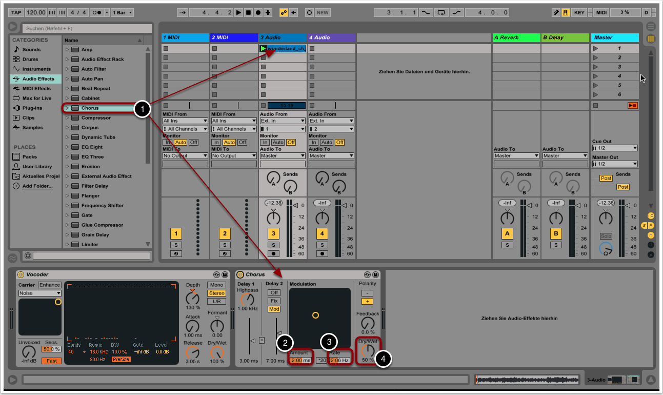 Als nächstes wählen wir Chorus aus und ziehen den Effekt ebenfalls auf den belegten Slot oder direkt rechts neben den Vocoder in dem Effekt-Rack (1).
