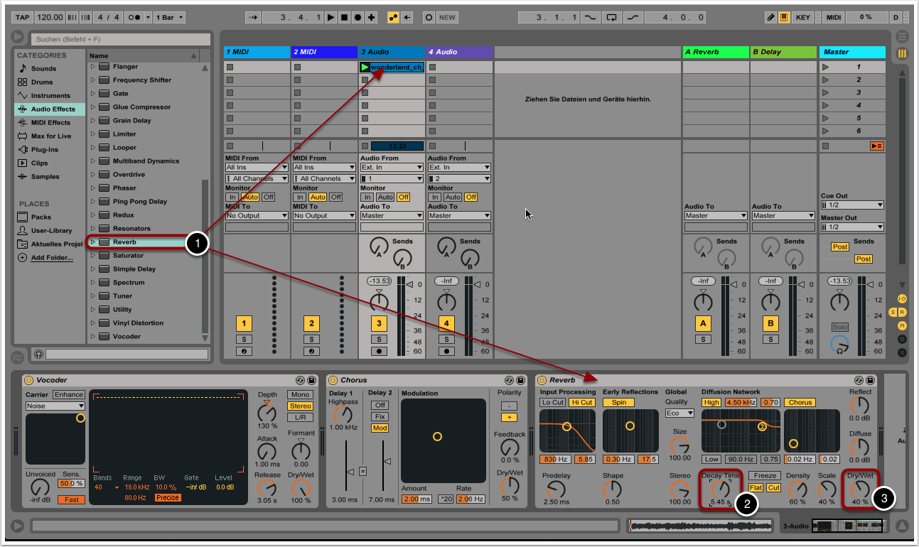 Die Decay-Time erhöhen wir auf 5-6 Sekunden (2) und das Dry-/Wet-Verhältnis regeln wir zurück auf 40% (3).