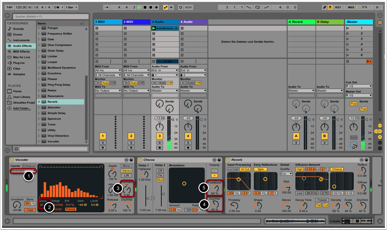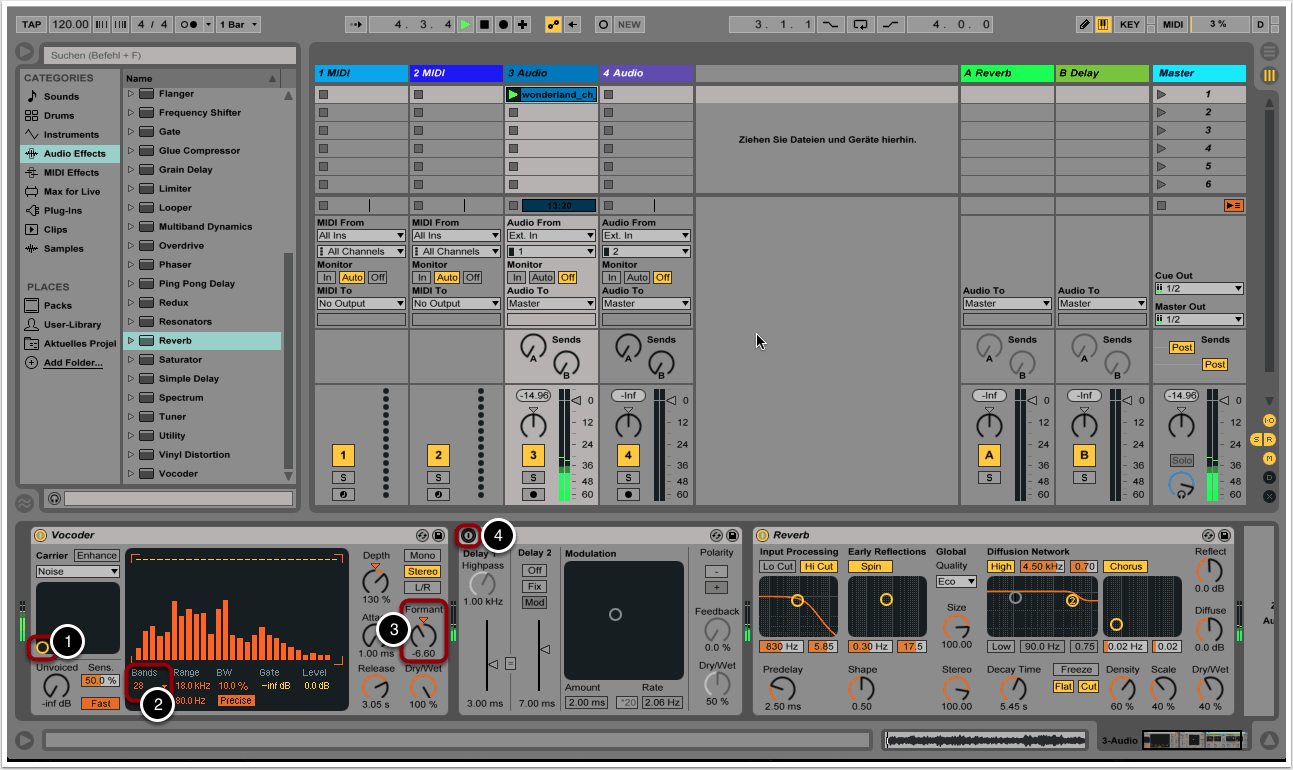 In diesem Tutorial wollen wir den integrierten Vocoder von Ableton Live benutzen, um atmosphärische Soundscapes und experimentelle Texturen zu gestalten. Als Ausgangsmaterial soll uns dazu ein simples Sprachsample (Klangbeispiel 01) dienen, welches wir durch den Vocoder und zusätzliche Audioeffekte klanglich verfremden (Klangbeispiel 02).