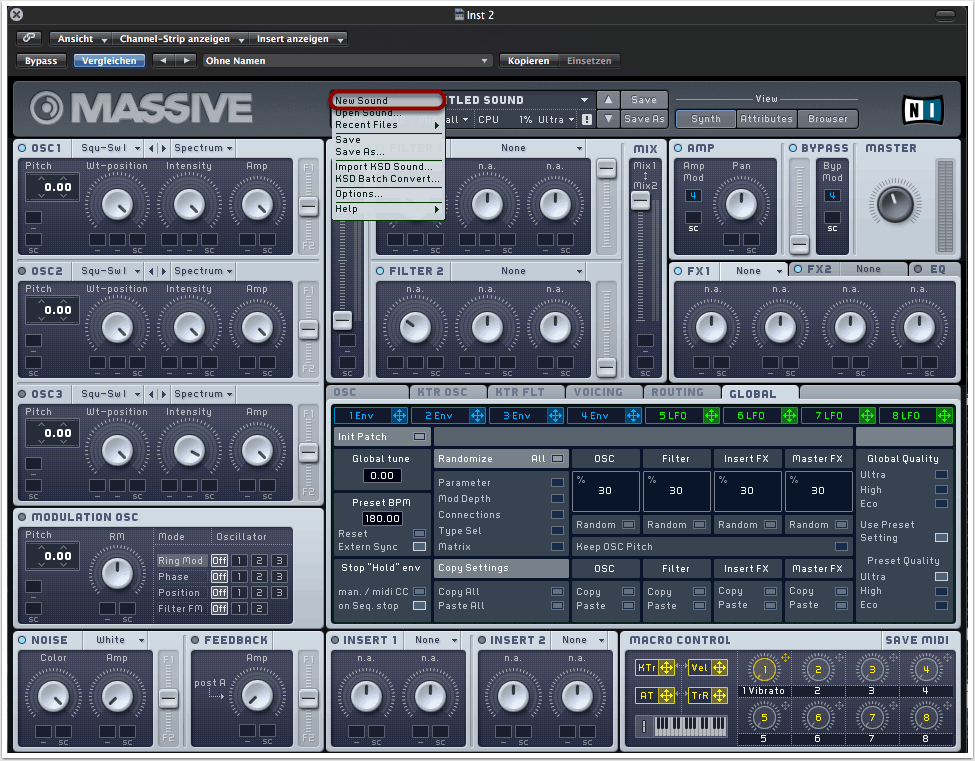 Wir öffnen Massive als Stand-Alone-Version oder als Plug-in einer beliebigen DAW. Über “File” -> “New Sound” laden wir einen neuen Patch.