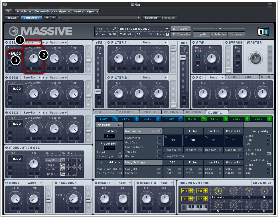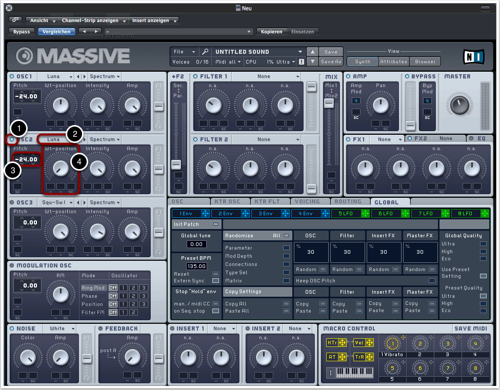 Anschließend transponieren wir Oszillator 1 um zwei Oktaven nach unten (3).