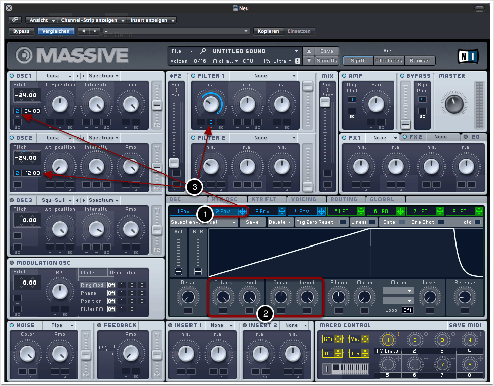 Indem wir die Positionen der Drehregler verändern, passen wir die Hüllkurve dem Verlauf aus der Abbildung an. Hierzu müssen lediglich die Regler “Attack” und “Level” komplett aufgedreht werden (2).