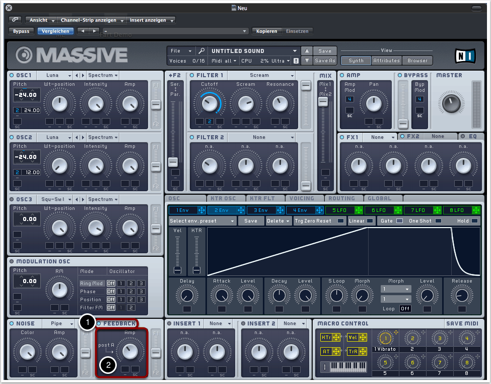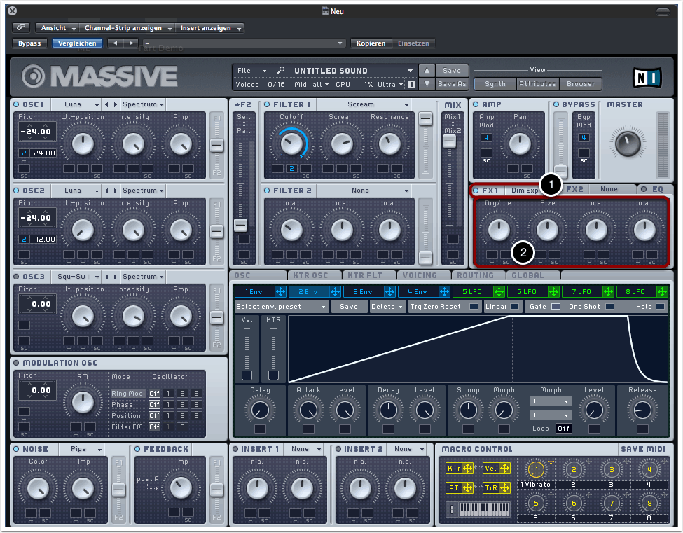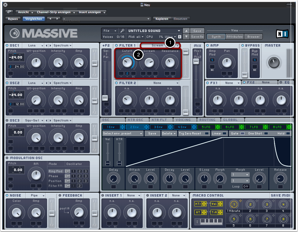 Um die Cutoff-Frequenz von der Hüllkurve steuern zu lassen, müssen wir natürlich auch ein Filter auswählen. Wir entscheiden uns für “Scream” als Filtertypen (1).
