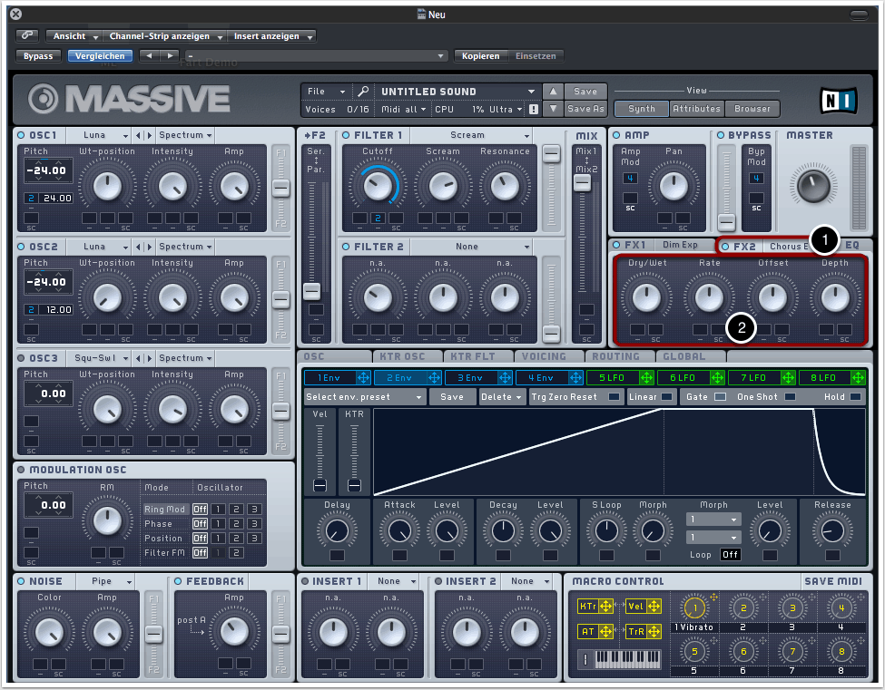 Wir wählen “Chorus” oder “Chorus Ensemble” als zweiten Effekt aus (1).