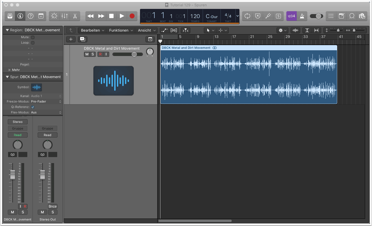 Per Drag&Drop oder über die Bibliothek von Logic X importieren wir die Audiodatei, die wir mit der Slice-Funktion bearbeiten möchten. In unserem Fall ist dies ein Soundeffekt, den wir in gleich große Segmente ohne Stille unterteilen wollen.