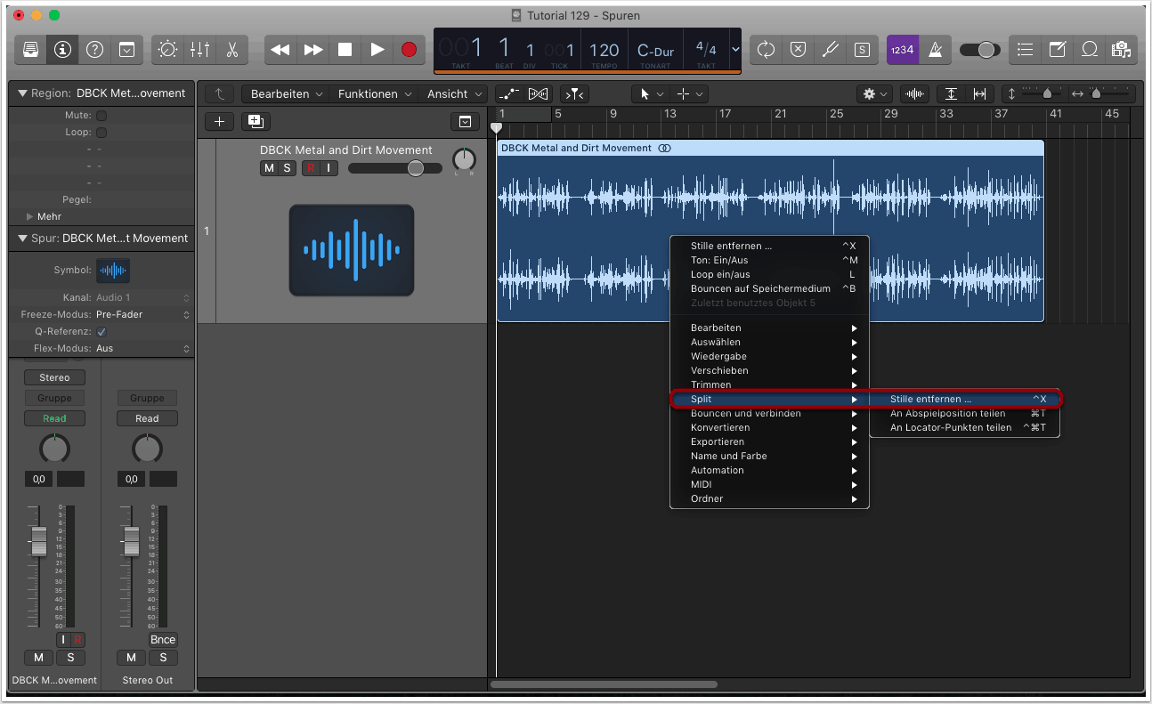 Die Slice-Option rufen wir auf, indem wir mit einem Rechtsklick auf die importierte Audioregion klicken und “Split” -> “Stille entfernen” auswählen. Alternativ können wir auch mit dem Shortcut ctrl+X den Slice-Editor aufrufen.