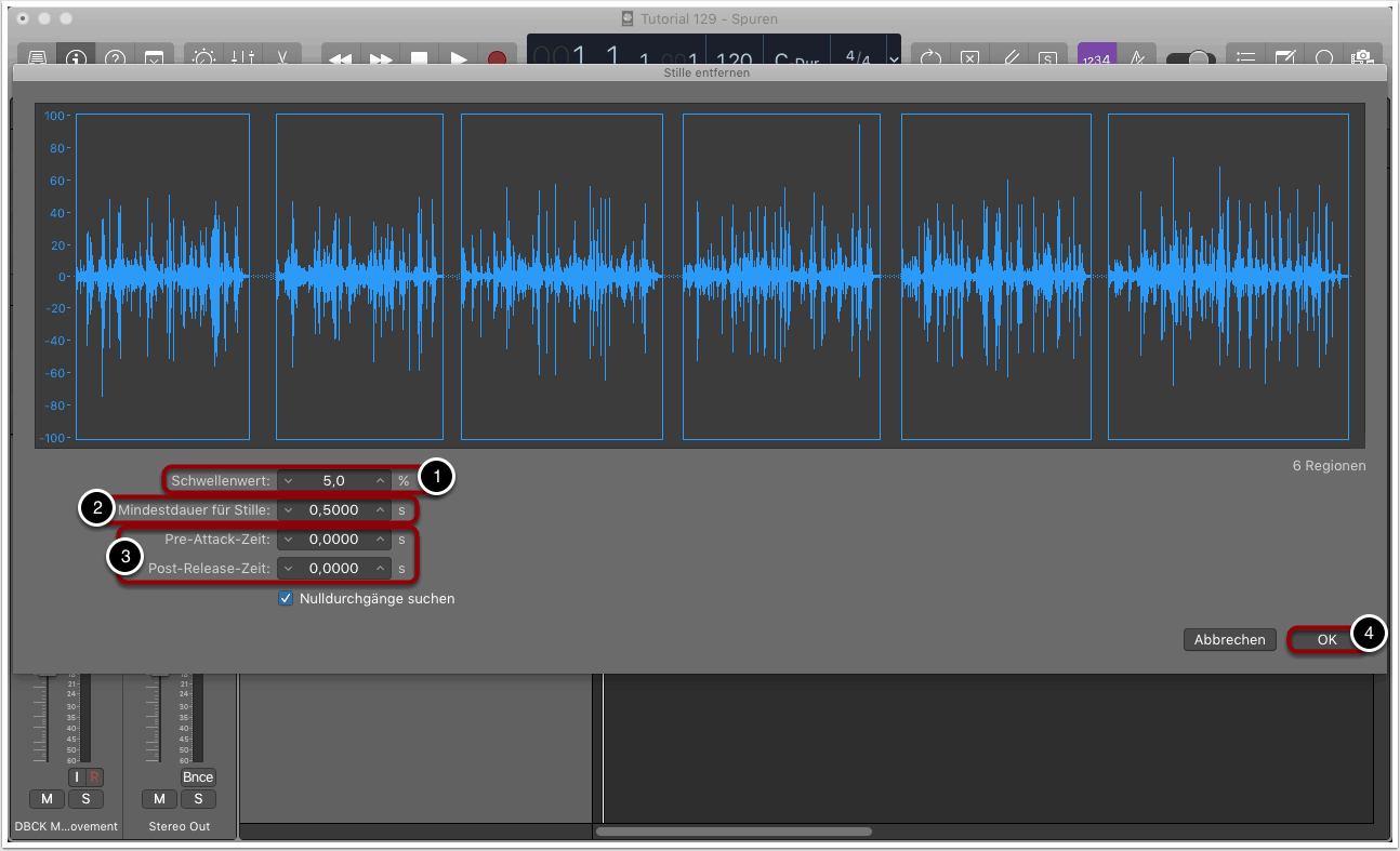 Mit der Mindestdauer für Stille können wir festlegen, wie lange die leisen Stellen des importieren Audiomaterials mindestens sein sollen, bevor der nächste Schnitt erfolgt. Dieser Wert ist direkt abhängig vom zuvor festgelegten Schwellenwert. Hier gilt: Je größer dieser Wert, desto weniger neue Audioregionen werden erstellt (2).