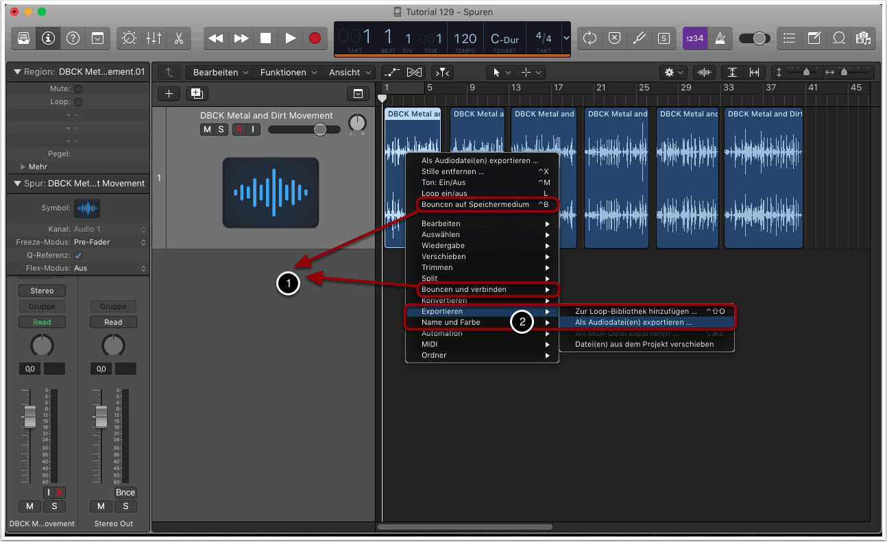 Alternativ können wir auch alle Audioregionen markieren und die Option “Exportieren” -> “Als Audiodatei(en) exportieren” auswählen (2). Mit dieser Option werden unmittelbar alle ausgewählten Audioregionen als neue Dateien im gewählten Zielordner separat abgespeichert. Dies hat im Vergleich zur oberen Methode jedoch den Nachteil, dass Automationen, Fades und Effekte nicht in die neuen Audiodateien integriert werden können. Dies funktioniert nur mit der Bounce-Option!