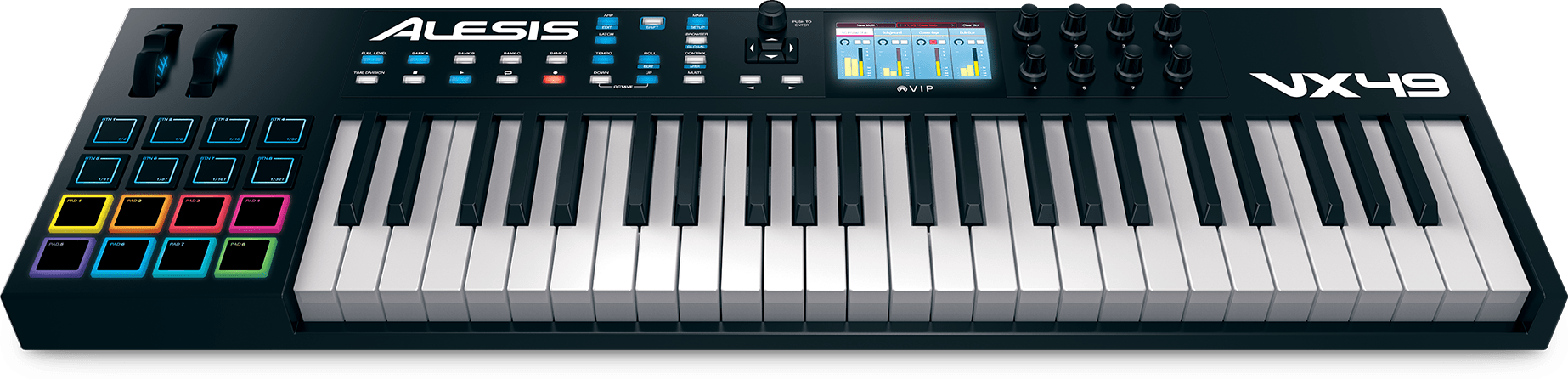 Key-Feature des neuen 49-Tasten-Keyboards von Alesis ist eine erweiterte Kontrolle virtueller Instrumente durch eine integrierte VIP-Software (Virtual Instrument Player). Damit soll jedes VST-Instrument unmittelbar am VX49-Keyboard auswählbar und über einen kleinen Bildschirm ansteuerbar sein.