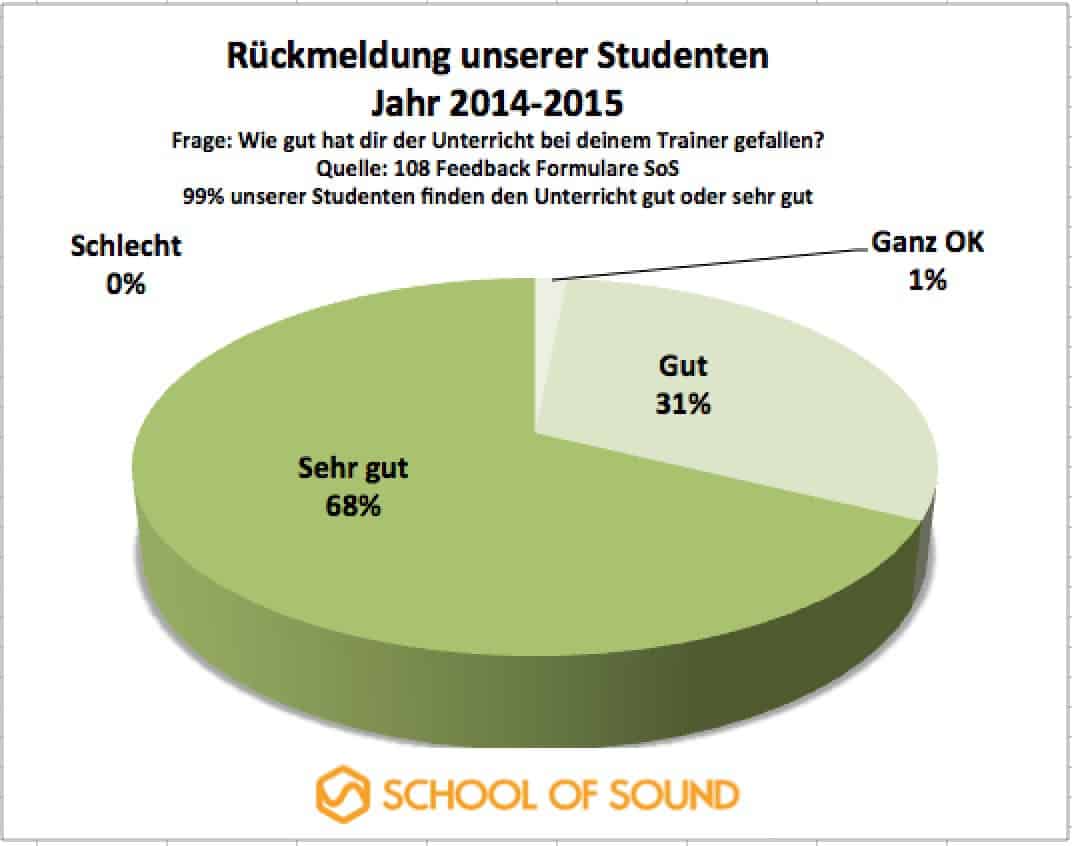 - 99% der School of Sound Studenten geben den Trainern eine Gute bis sehr gute Note. Fast 70% gaben die Note “sehr gut”, und über 30 % die Note “gut”. Lediglich 1% ist der Meinung dass der Trainer “Ganz OK” war. Niemand fand die Betreuung ungenügend.
