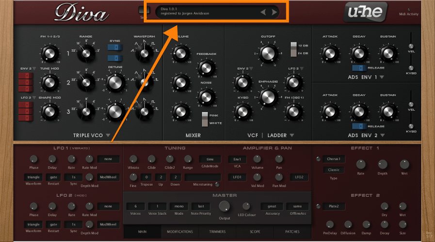 Das Bild oben zeigt eine lizensierte Version von U-HE Diva.