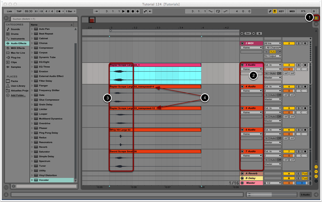 Manche Samples haben wir bereits vor dem Import mit dem kostenlosen Programm Audacity um einige Halbtöne nach oben oder unten transponiert. Dies ist Geschmacksache und erfordert ein wenig Experimentierfreude. Eine gute Mischung aus transponierten und nicht transponierten Klängen kann den finalen Sound breiter und epischer erscheinen lassen (4).