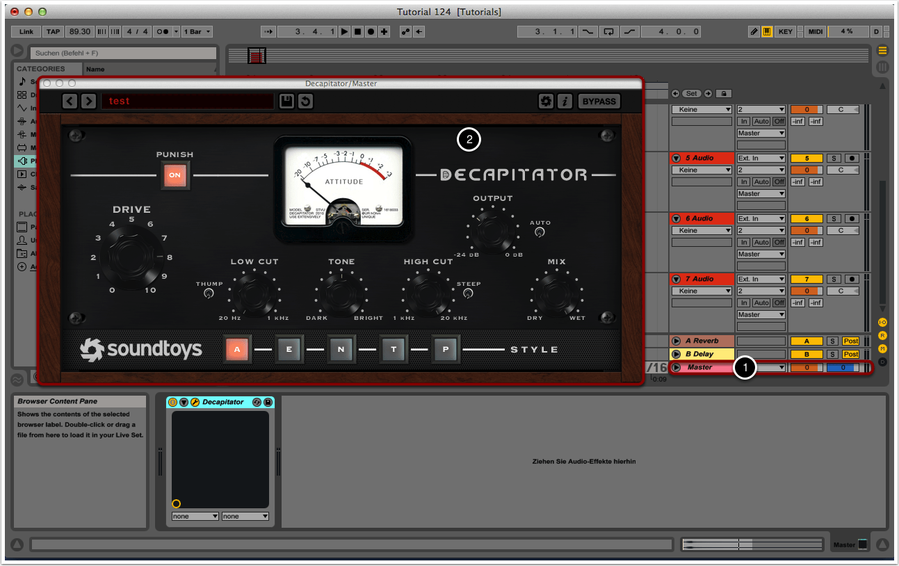 Da wir die folgenden Effekte auf alle Klangschichten anwenden wollen, aus denen sich der finale SFX zusammensetzt, wählen wir zunächst die Master-Spur an (1).