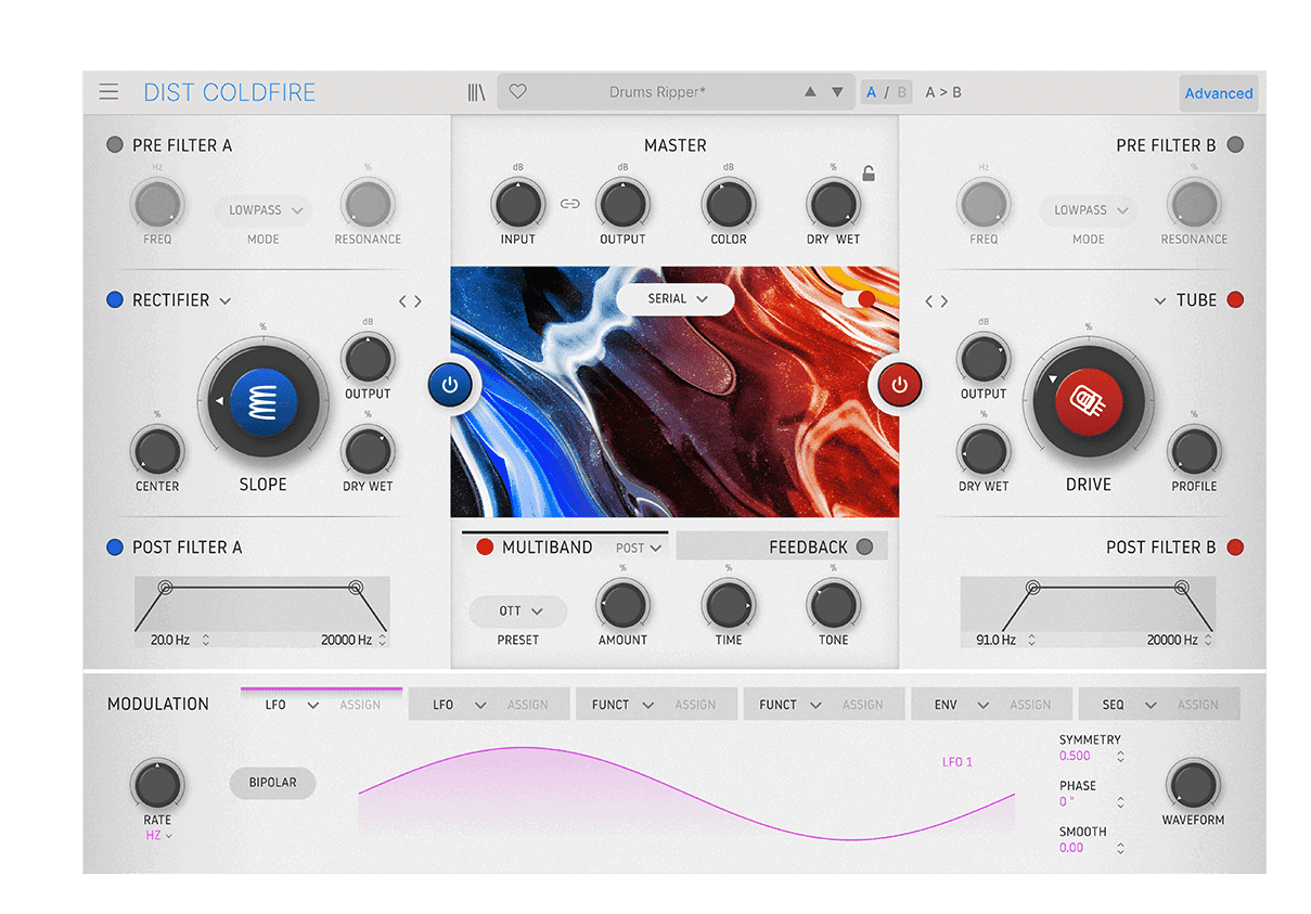 Dist Coldfire ist ein neuer Distortion-Effekt aus dem Hause Arturia. Mit dem Plug-in lässt sich eine große Bandbreite an Verzerrungen erzeugen, die von leicher Röhrensättigung bis zur völligen Klangzerstörung reichen.