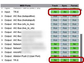 Dies findest du unter -> Voreinstellungen -> Link Midi -> Häkchen runterklappen bei Output: TR-8