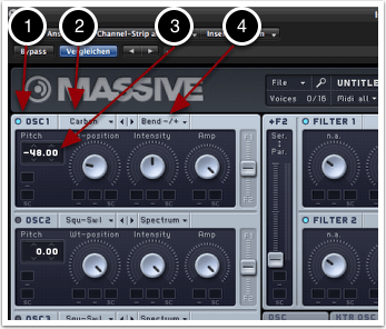Zunächst bestimmen wir die Eigenschaften des Oszillators: Wir aktivieren OSC1 durch Anklicken der LED-Anzeige (1), wählen „Carbon“ als Wellenform aus (2) und stimmen den Oszillator um ganze 48 Halbtonschritte bzw. 4 Oktaven nach unten (3). MIDI C3 (in etwa die mittlere Taste des MIDI-Keyboards) ist unsere Ausgangsbasis. Anschließend wählen wir anstatt „Spectrum“ „Bend -/+“ aus. (4)