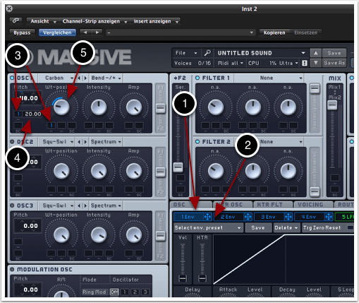 Wir wollen diese Hüllkurve benutzen, um damit sowohl den Pitch als auch die Wavetable-Position zu modulieren. Um dies zu tun, klicken wir auf den Kreuzpfeil neben „1Env“ (2) und dann erneut auf die kleinen Kästchen in Oszillator 1 – jeweils einmal in das Kästchen unter „Wt-position“ und einmal im Bereich „Pitch“ unter der Anzeige, in der wir den Pitch bereits verändert haben (3). Hier sollte nun die Nummer „1“ stehen.