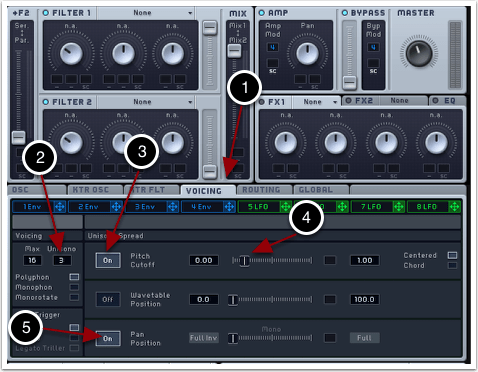 Im Bereich „Voicing“ (1) erzielen wir einen Phaser/Ensemble-Effekt, in dem wir die Anzahl der Stimmen erhöhen und minimal gegeneinander Verstimmen. Wir tragen dazu bei „Unisono“ den Wert „3“ (2) ein, aktivieren das Feld „Pitch Cutoff“ (3) und ziehen den Regler daneben ein kleines Stück nach rechts (4). Je weiter dieser Regler nach rechts gezogen wird, umso größer wird die Verstimmung. Die Bassline sollte jetzt schon wesentlich fetter und weniger monoton klingen. Ferner aktivieren wir in der Voicing-Sektion das Feld „Pan Position“ (5), um die Bassline auch im Stereopanorama schön breit wirken zu lassen.