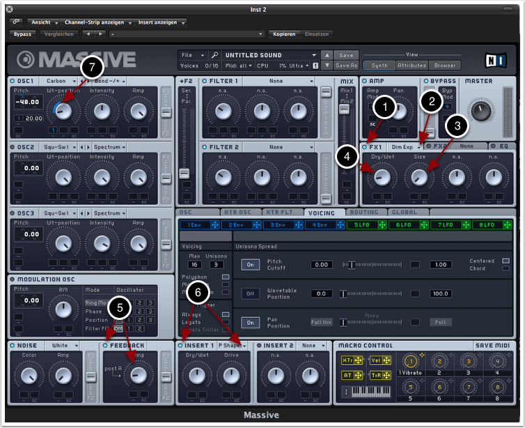 Als weitere Effekte geben wir nun noch etwas „Feedback“ (5) hinzu sowie den „Parabolic Shaper“ (6) – beides im Massive-GUI unten links. Es lohnt sich mit den einzelnen Parametern zu experimentieren, da die hier gemachten Angaben natürlich nur Beispielwerte sind und nach Belieben modifiziert werden können. Verändert man beispielsweise die Position des Wavetable-Drehreglers in der Oszillator-Sektion (7), lassen sich sehr schnell neue und interessante Variationen des Patches kreieren.