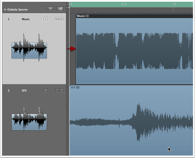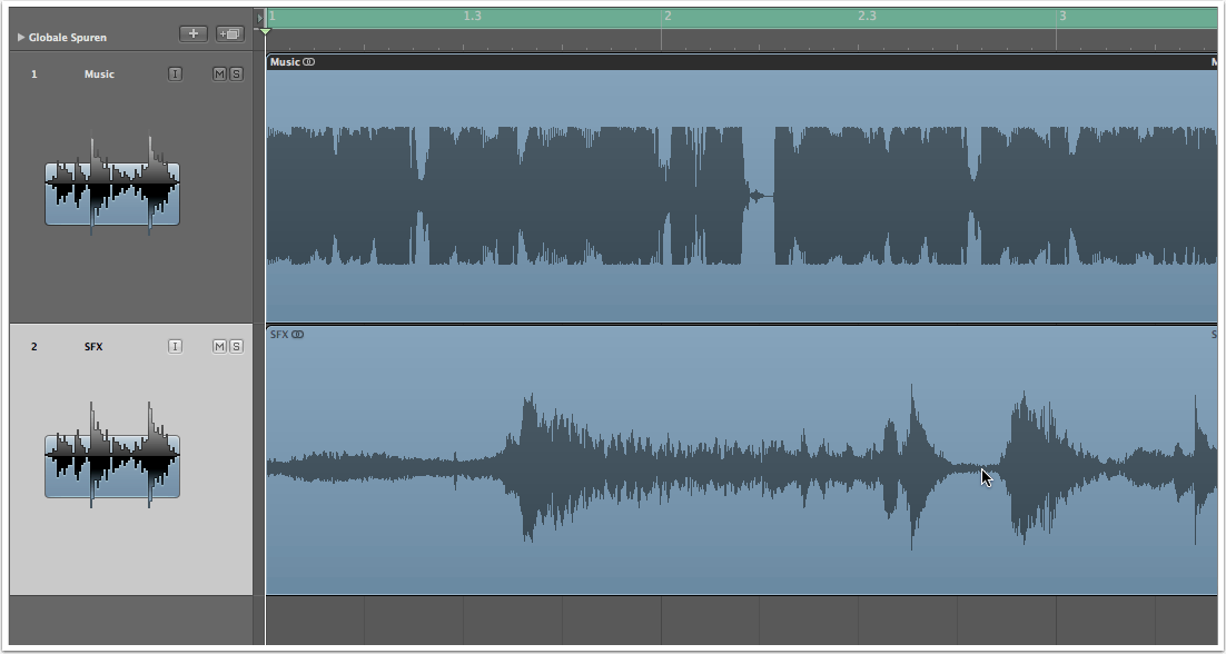 Wir begnügen uns mit dem klassischen Beispiel einer Mischung von Sound Effekten und Musik, aus denen ein homogenes und tranparentes Klangbild zu formen ist. Eine Audiospur in unserer DAW ist der Musik vorbehalten und eine zweite den Klangeffekten, die hier bereits als eine einzige Audiofile gebounced wurden.
