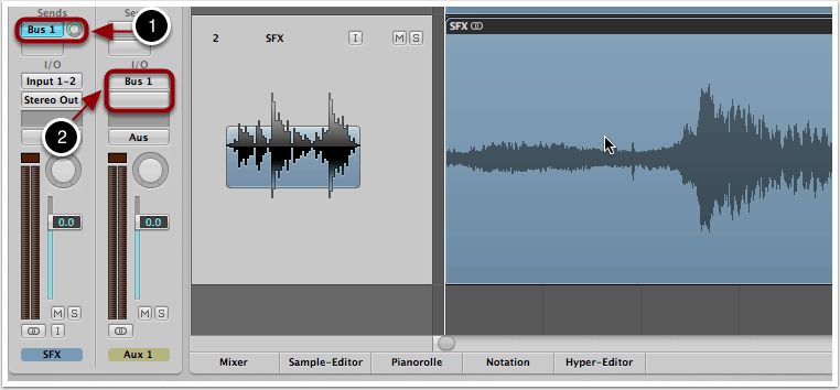 Wir wählen erneut die SFX-Spur an und senden das Output-Signal nicht direkt an den Master-Output, sondern schalten einen zweiten Bus bzw. Aux-Kanal dazwischen (1).