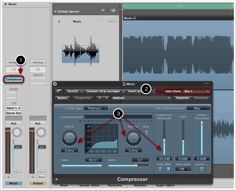 Wir wählen die Musikspur an und wählen einen Kompressor als Plug-in aus – in diesem Fall der integrierte Kompressor von Logic Pro (1). Als Sidechain-Input wählen wir Bus 1 aus, an den wir zuvor unser SFX-Signal gesendet haben (2). Bei den Kompressor-Einstellung ist das Trial-and-Error-Verfahren zu empfehlen, doch grob gesagt sollte die Attack- bzw. Release-Zeit relativ kurz gehalten werden und der Threshold recht weit unten, damit das Ducking auch wahrzunehmen ist (3).