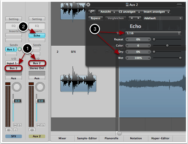 Mit einem Delay-Effekt verzögern wir nun das Signal um wenige Millisekunden, bevor es vom Master-Output ausgegeben wird. Wir benutzen hierfür das Echo-Plug-in von Logic Pro (2).