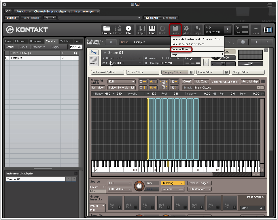 Nachdem wir das Mapping nach Belieben angepasst haben, können wir das .nkm oder .nki speichern, indem wir über “Files” -> “Save multi as” auswählen. Die verwendeten Samples sollten danach nicht ihren Pfad auf der Festplatte ändern, da ansonsten Kontakt Schwierigkeiten haben könnte, diese später wieder zu finden.