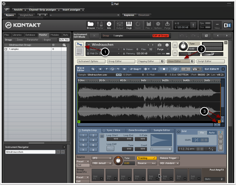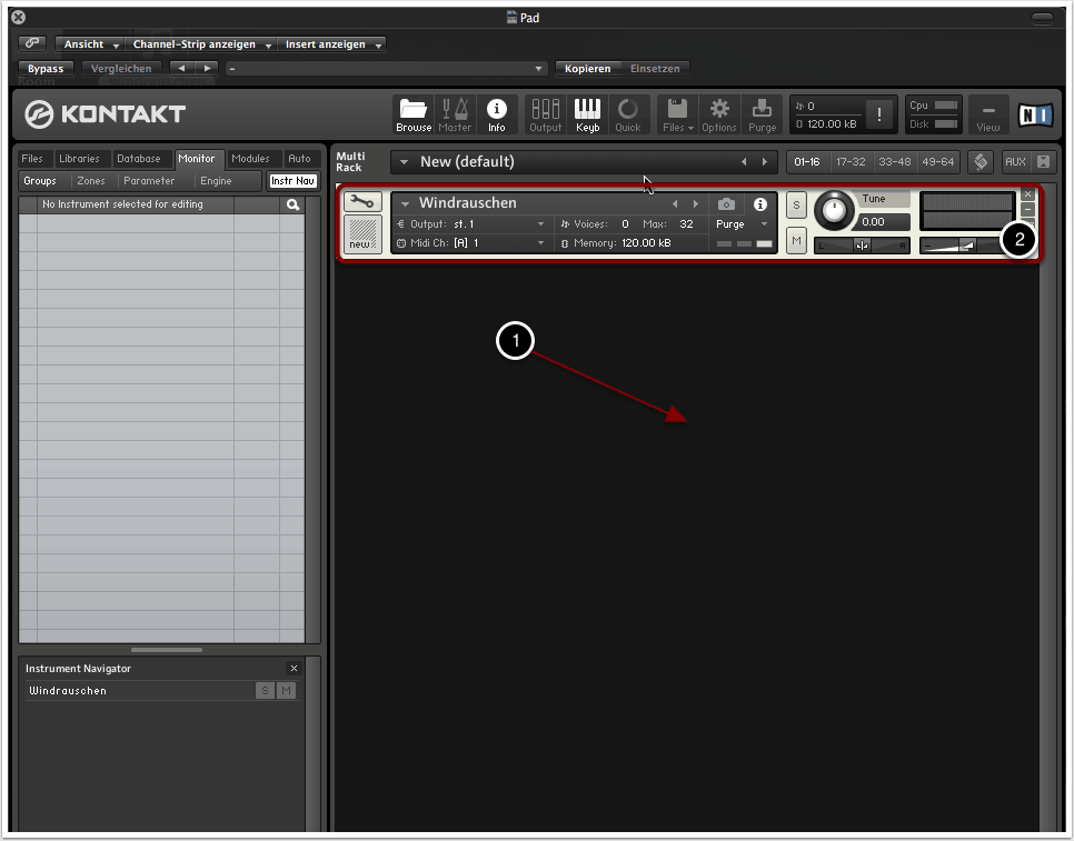 Wir öffnen Kontakt in unserer DAW oder als Stand-Alone-Version und ziehen per Drag&Drop das zu bearbeitende Sample in den leeren, schwarzen Bereich (1).