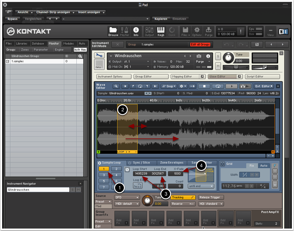 Angenommen, man hat beispielsweise einen längeren Pad-Sound oder eine Aufnahme von Meeresrauschen und möchte, dass der Anfang des Samples nur einmal erklingt und der Loop erst ab einem gewissen Zeitpunkt einsetzt. Mit dem Kontakt-Sampler von Native Instruments lässt sich dies relativ einfach verwirklichen. Im Folgenden zeigen wir, wie genau das geht.