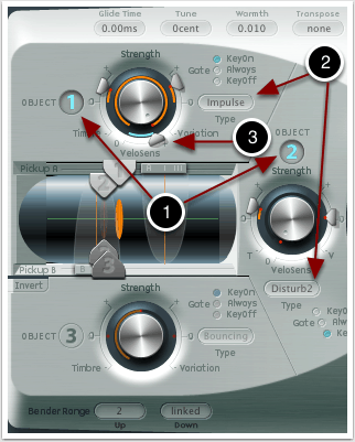 Der hellgraue Bereich auf der linken Seite beschreibt die Oszillator-Eigenschaften. Wir aktivieren Oszillator 1 und 2 durch einen Mausklick (1), wählen “Impulse” und “Disturb2” als Art der Oszillation (2) und stellen die Parameter entsprechend der Abbildung ein. Oszillator 3 benötigen wir nicht.