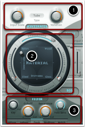 Wir schalten durch einen Mausklick den Waveshaper hinzu, der den Klang etwas fetter und aggressiver wirken lässt (1). Dies ist definitiv kein Muss – in der zweiten Hälte unseres Klangbeispiels haben wir den Waveshaper zur Demonstation ausgeschaltet.