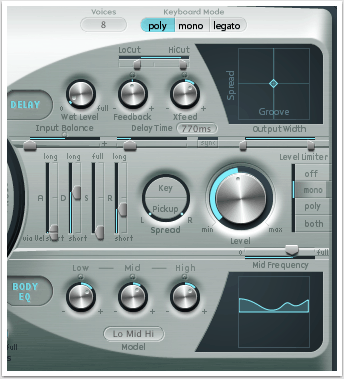 Wir schalten ein Delay und einen EQ hinzu und übernehmen erneut die Einstellungen aus der Abbildung. Die Delay Time haben wir in unserem Beispiel auf 770ms gesetzt bei einem Mastertempo von 120BPM. In der mittleren Sektion können wir die ASDR-Kurve definieren. Die Regler für Attack und Sustain ziehen wir ganz nach unten, die Release-Dauer stellen wir auf 120ms und die Decay-Dauer auf 1000ms.