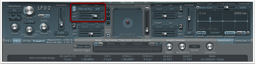 Lebendiger und realistischer lassen wir unseren Lead Sound erscheinen, indem wir einen LFO hinzuschalten, der die Position der virtuellen Pickup-Mikrofone im hellgrauen Bereich auf der linken Seite steuert. Jene extravaganten Steuerungsmöglichkeiten sind es, die Sculpture so einzigartig machen, die aber auch eine Menge Einarbeitungszeit in Anspruch nehmen. Ein weiteres Mal übernehmen wir die Parameter-Settings aus der Abbildung.