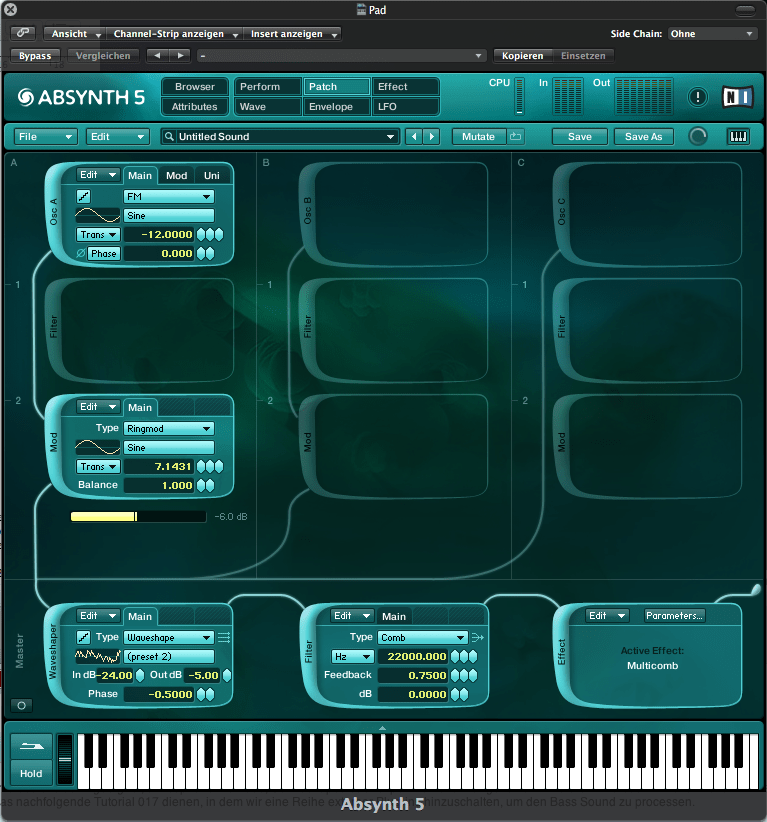 Unbestreitbar ist Absynth von Native Instruments bestens dazu geeignet, atmosphärische Pads, Soundscapes oder experimentelle Klangeffekte zu kreieren. In diesem Tutorial wollen wir zeigen, dass man auch einen schlichten Bass Lead Sound mit dem Synthesizer erzeugen kann. Der mit Absynth erstellte Patch soll als Gundlage für das nachfolgende Tutorial 017 dienen, in dem wir eine Reihe externer Plug-ins hinzuschalten, um den Bass Sound zu processen.