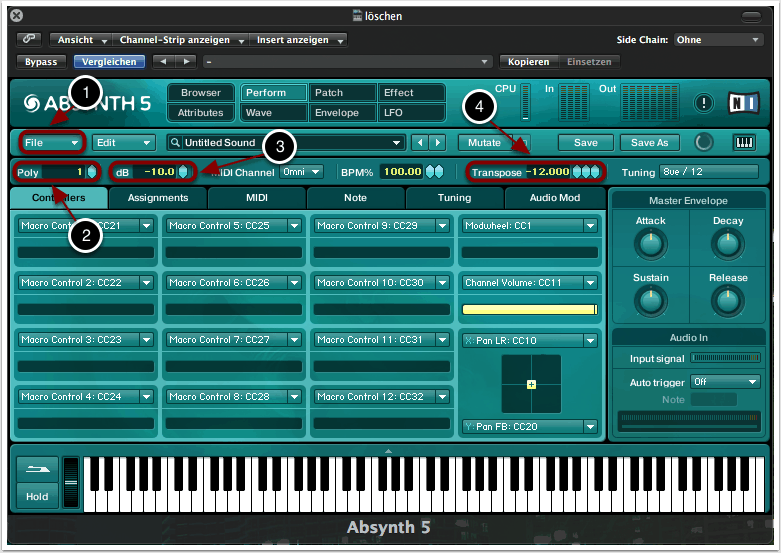 Da wir einen Bass Sound erzeugen wollen, transponieren wir den Patch um eine Oktave bzw. 12 Halbtonschritte nach unten (4).
