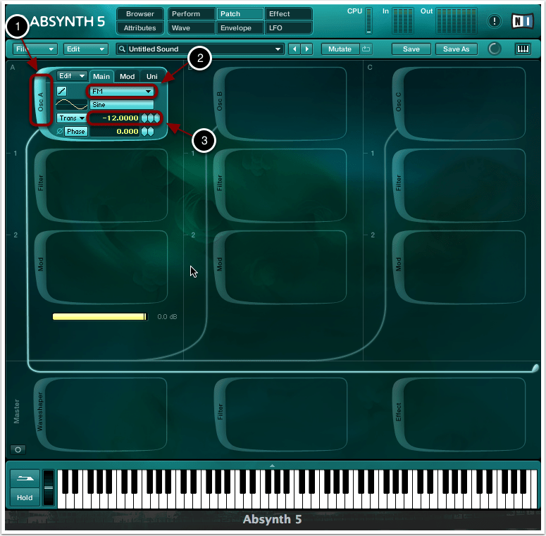 Im Patch-Menü aktivieren wir Oszillator A durch einen Mausklick in das zunächst noch leere Feld (1).