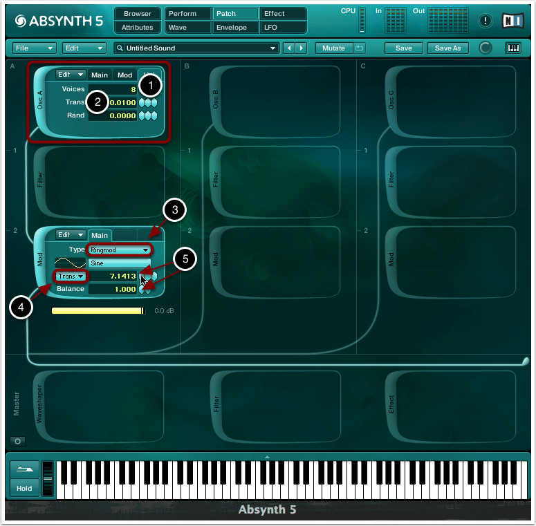 Wir schalten einen Modulationseffekt hinzu und wählen den Ringmodulator aus (3). Die Transposition soll nicht durch Herz erfolgen, sondern durch absolute Werte. Wir wählen also “Trans” aus (4) und tragen die Werte entsprechend der Abbildung ein (5).
