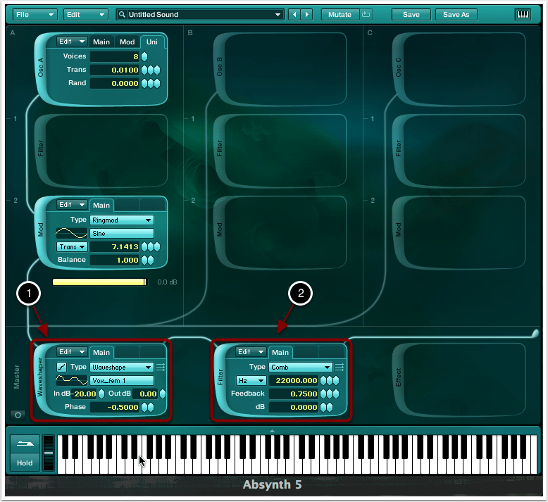Wir öffnen Absynth und laden unter “File” -> “New Sound” einen leeren Patch (1).
