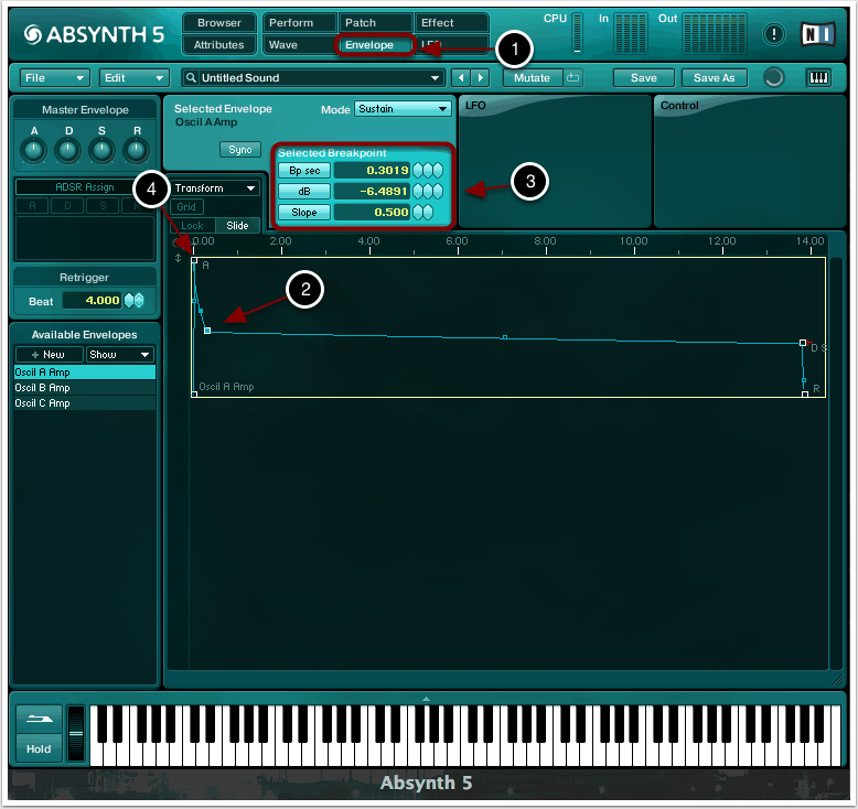 Im Menüpunkt “Envelope” können wir die Eigenschaften der Hüllkurve definieren (1).