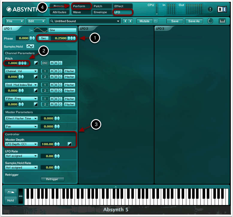 Im Menüpunkt “Perform” reduzieren wir die Anzahl der Stimmen auf 1 (2) und den Master-Gain bringen wir auf den Wert -10dB (3).