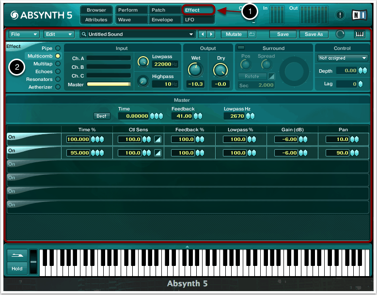 Im Menüpunkt “Effect” können wir einen Raumeffekt hinzuschalten (1).
