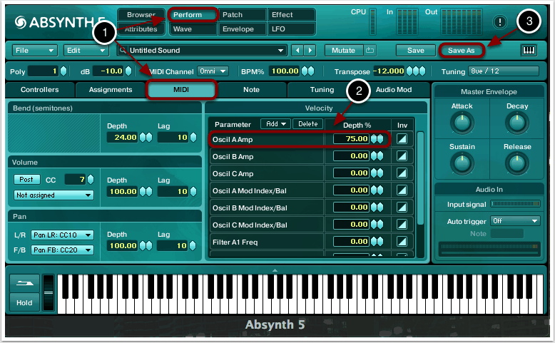 In unserem Beispiel benutzen wir hierfür den wohl offensichtlichsten Parameter – die Lautstärke – und tragen bei Oscil A Amp den Wert 75 ein (2). Je fester wir nun auf eine beliebige Taste unseres MIDI-Keyboards drücken, desto lauter klingt der entsprechende Ton. Bei einem Wert von 100 anstelle von 75 ist der Unterschied zwischen leisestem und lautestem Ton maximal.