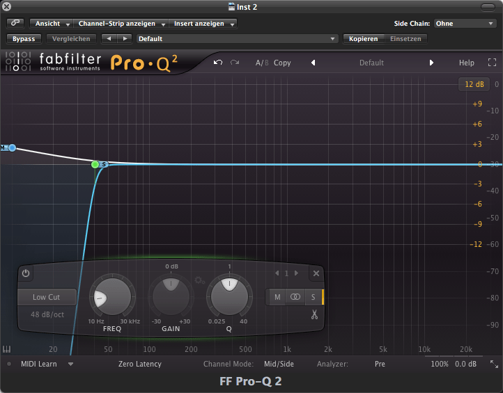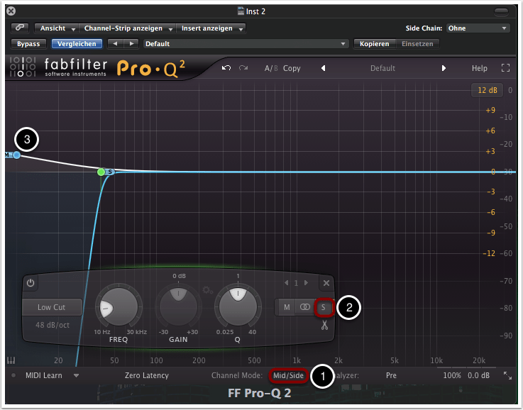 Bisher haben wir einen herkömmlichen Low-Cut-Filter angewendet, der alle Frequenzen unter 40Hz filtert. Unser Ziel ist jedoch, alle Frequenzen unter 40Hz mono zu machen. Anders formuliert bedeutet dies: Alle Stereo-Anteile unter 40Hz filtern. Dies erreichen wir, indem wir “Mid/Side” als Channel Mode auswählen und anschließend auf das kleine Symbol “S” (für “Side”) klicken (2). Die Frequenzkurve sollte sich nun blau färben. Durch diesen Schritt wirkt sich der Low-Cut-Filter nur auf die Frequenzanteile in Stereo aus, während die Signalanteile unter 40Hz in Mono bestehen bleiben.
