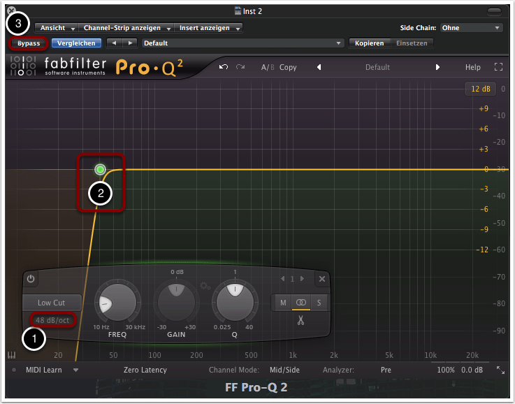 Um festzustellen, welche Frequenz man am Besten wählen sollte, macht es Sinn, am Ende den Pro-Q auf “Bypass” zu schalten und gegenzuhören (3). Ein Unterschied sollte nur minimal bis überhaupt nicht wahrzunehmen sein. Natürlich sollte man dafür möglichst über gute Subwoofer oder Lautsprecher, die diesen Frequenzbereich auch übertragen können, verfügen. Tut man dies nicht, kann ein Mittelwert von 40Hz bei 48dB/Oktave verwendet werden.