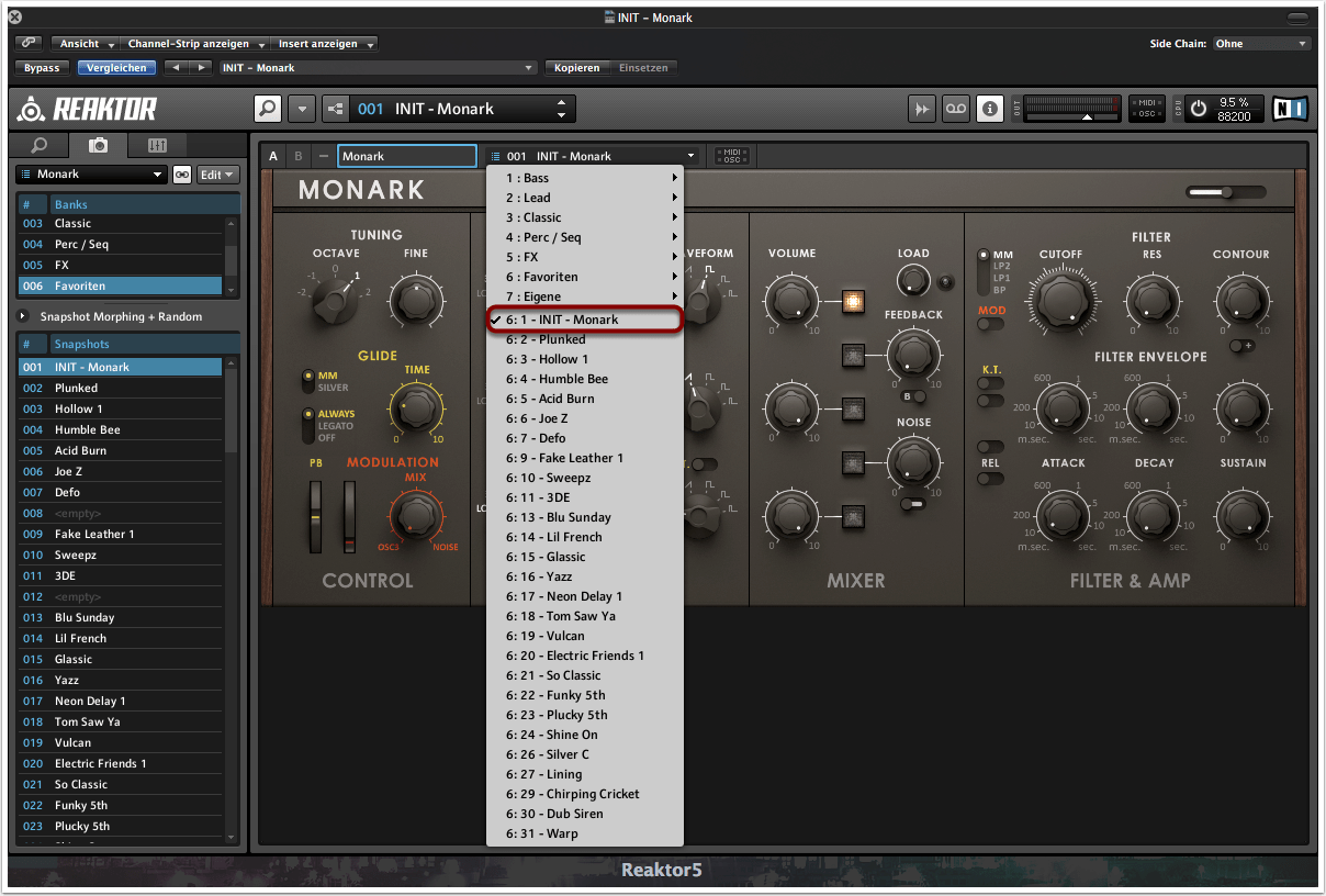 Wir öffnen Reaktor in der DAW unserer Wahl und laden eine Instanz von Monark. Über das Dropdown-Menü laden wir einen leeren Patch, indem wir “INIT – Monark” auswählen.