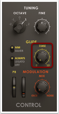 Die Einstellungen im Control-Menü lassen wir in den Default-Werten, abgesehen von “Time” bei der Glide-Funktion. Diesen Drehregler ziehen wir bis ganz nach unten.