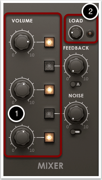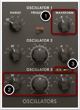 Wir aktivieren zunächst alle drei Volume-Regler für die drei Oszillatoren und bringen diese anschließend in etwa auf die Werte aus der Abbildung (1).